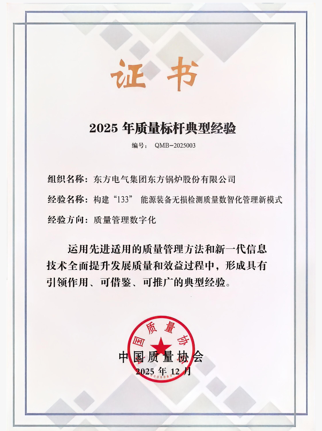 東方鍋爐《構建“133”能源裝備無損檢測質量數智化管理新模式》立足能源裝備安全可靠性要求高、焊接結構復雜、檢測難度大等行業特點,全面構建“一個目標、三類路徑、三大支撐”的質量管理模式,聚焦“質檢方式數字化、質檢過程自動化、結果評定智能化”三化突破,使質量控制從“缺陷檢測”向“風險預防”、從“經驗判斷”向“智能決策”系統躍升。
