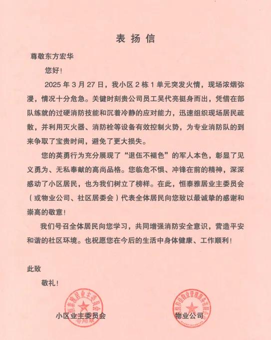 給東方宏華發來表揚信