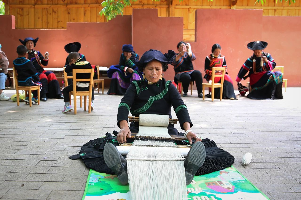 昭覺縣特布洛村村民正在村民活動廣場手工染織“查爾瓦”(“查爾瓦”是彝族地區不論男女都喜歡披的一種羊毛織披氈)