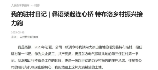 近日,“牢記囑托 駐村興農(nóng)”駐村第一書記交流會暨2025年版《駐村第一書記說》專欄發(fā)布會在北京人民日報社舉行。東方電氣集團應邀參加,駐昭覺縣特布洛村第一書記楊振參會,與來自全國10余個省份的駐村第一書記、專家學者、企業(yè)代表及媒體記者,就黨建引領、產(chǎn)業(yè)融合、數(shù)字化賦能等鄉(xiāng)村振興關鍵議題展開深入交流。