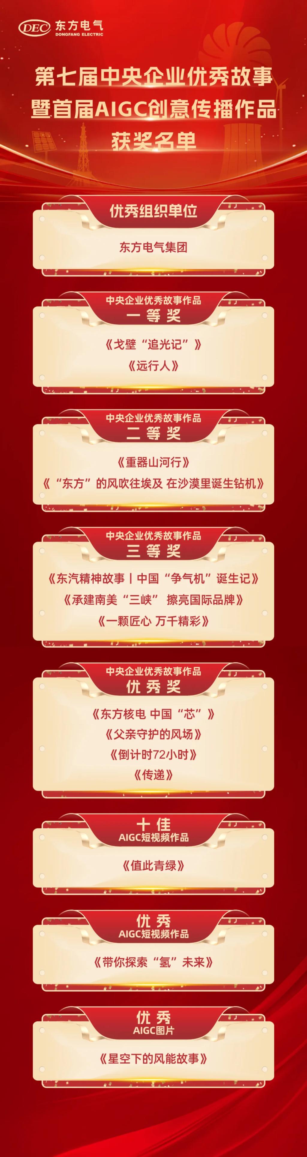 其中,《戈壁“追光記”》《遠行人》榮獲中央企業(yè)優(yōu)秀故事作品一等獎,《重器山河行》《“東方”的風(fēng)吹往埃及 在沙漠里誕生鉆機》榮獲中央企業(yè)優(yōu)秀故事作品二等獎,《東汽精神故事丨中國“爭氣機”誕生記》《承建南美“三峽”擦亮國際品牌》《一顆匠心 萬千精彩》榮獲中央企業(yè)優(yōu)秀故事作品三等獎,《東方核電 中國“芯”》《父親守護的風(fēng)場》《倒計時72小時》《傳遞》榮獲中央企業(yè)優(yōu)秀故事作品優(yōu)秀獎,《值此青綠》獲評十佳AIGC短視頻作品,《帶你探索“氫”未來》獲評優(yōu)秀AIGC短視頻作品,《星空下的風(fēng)能故事》獲評優(yōu)秀AIGC圖片。